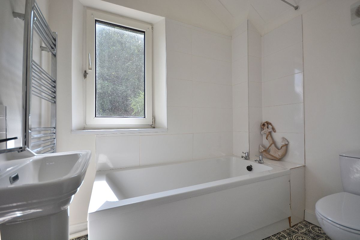 An en suite bathroom accessed off the rear bedroom with a three piece suite comprising a panelled bath, low flush WC and a wash hand basin with chrome mixer tap. There is a chrome heated towel radiator, ceiling lighting and an obscure double glazed window to the rear elevation.