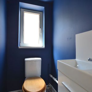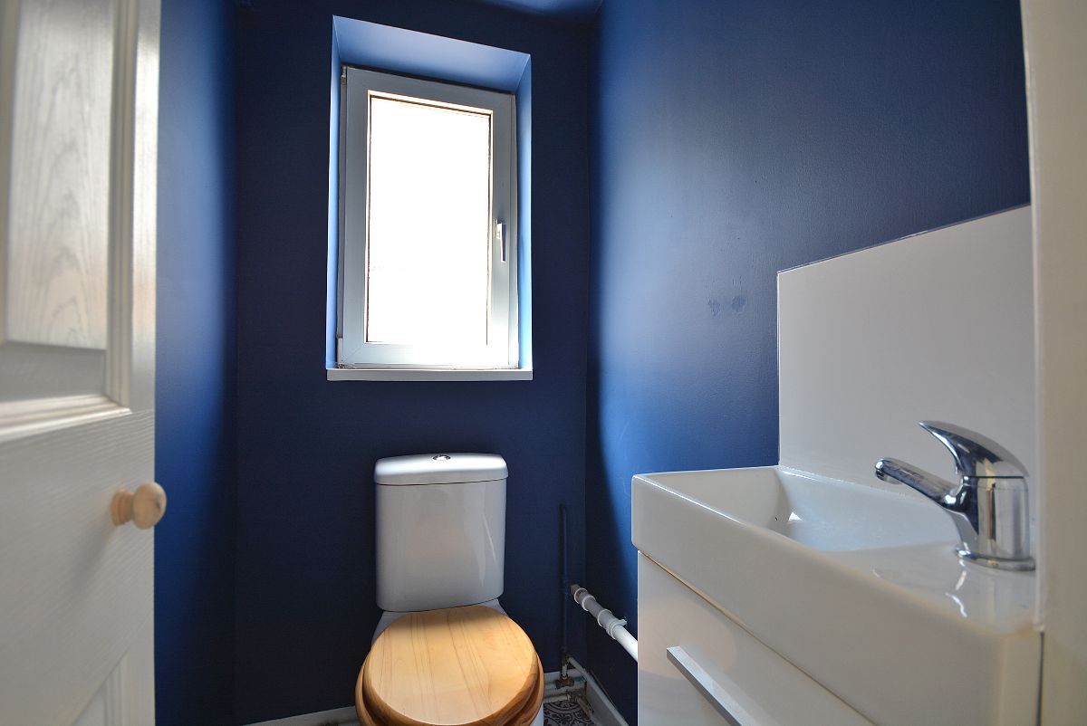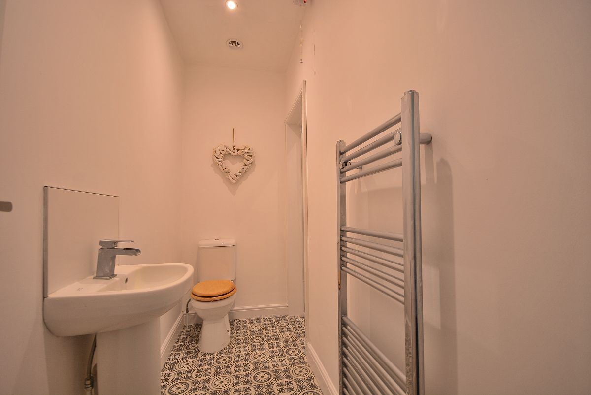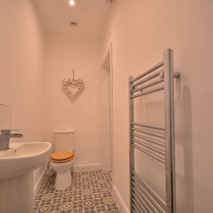 With a low flush WC and a wash hand basin with chrome mixer tap. There is also a radiator, ceiling light point and an obscure double glazed window to the side elevation.