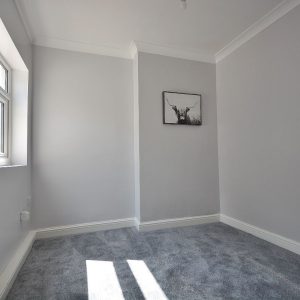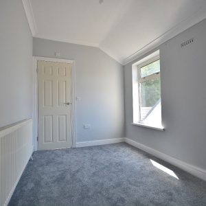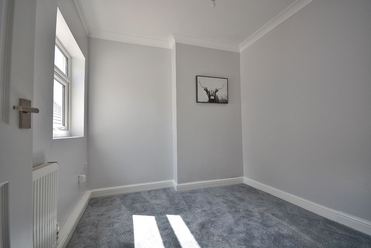 A third bedroom with a radiator, ceiling lighting and a double glazed window to the rear elevation.