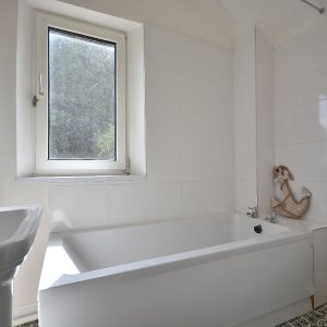 An en suite bathroom accessed off the rear bedroom with a three piece suite comprising a panelled bath, low flush WC and a wash hand basin with chrome mixer tap. There is a chrome heated towel radiator, ceiling lighting and an obscure double glazed window to the rear elevation.