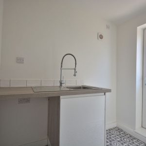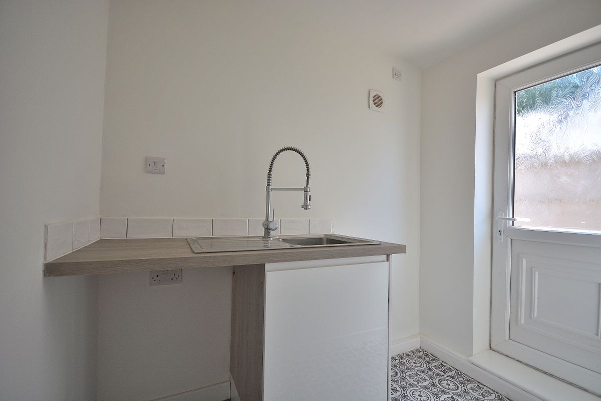 A handy utility room with base unit with working surface and inset sink with drainer and chrome mixer tap. There is plumbing for washing machine, ceiling lighting and a door opening onto the rear elevation.