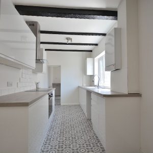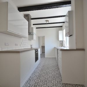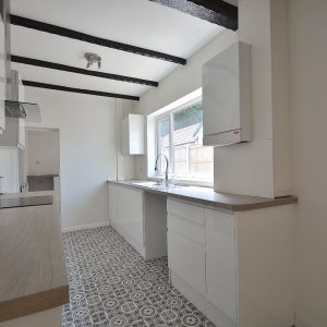 A sleek & stylish kitchen with a range of wall cupboards, base units and drawers with working surfaces over. Inset sink with drainer and chrome mixer tap. Integrated oven, four ring electric hob with wall mounted extractor hood. There is also space for a fridge freezer and plumbing for a dishwasher, ceiling lighting, tiled splashbacks, double glazed window and door to the rear elevations.