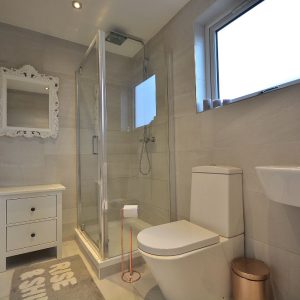 Having a modern four piece suite with chrome fittings comprising a panelled bath with mixer tap. Separate tiled shower enclosure. Pedestal wash hand basin with mixer tap. Low flush WC. Tiled floor, fully tiled walls, four ceiling spotlights, extractor fan, chrome heated towel rail and obscure double glazed window to the side elevation.