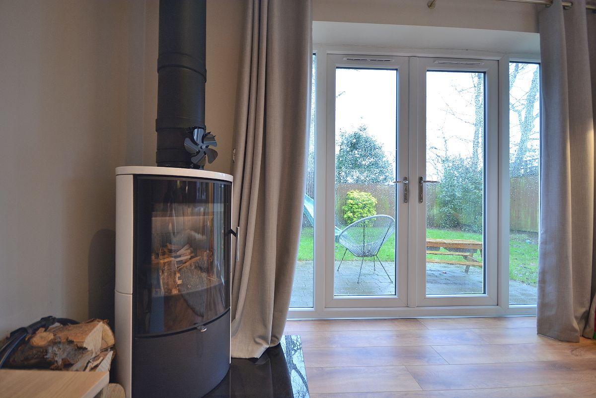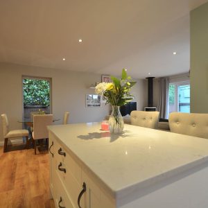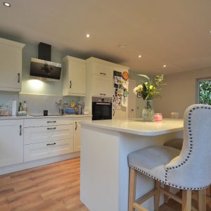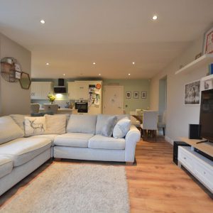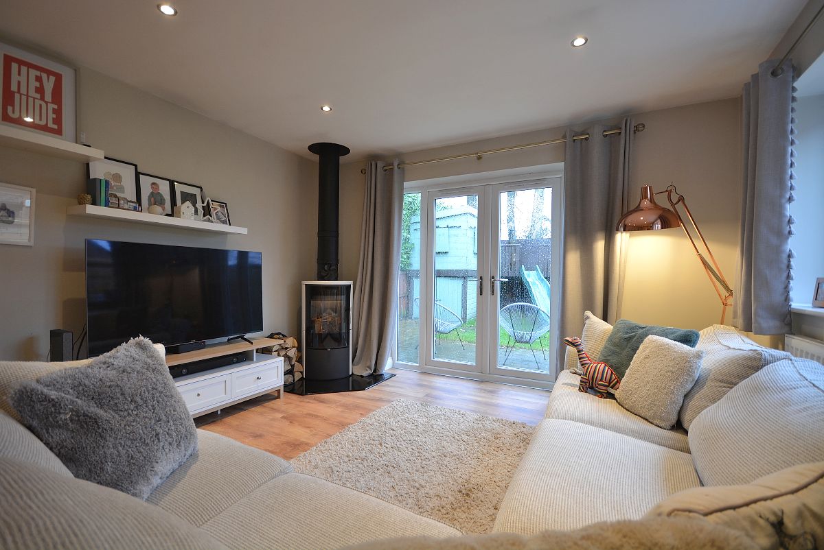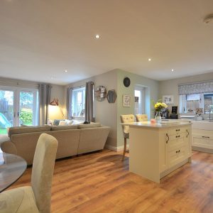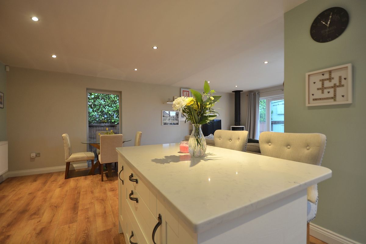 A spacious L-shaped open plan living kitchen with French doors leading out onto the rear garden and stunning feature contemporary log burner with exposed flue. The kitchen features a range of high gloss contemporary cabinets comprising wall cupboards, base, units and drawers with quartz worktops above. Inset sink with drainer and mixer tap. Integrated electric oven, four ring electric hob and stainless steel extractor hood above. Integrated dishwasher and washing machine. Integrated fridge/freezer. There is a central island/breakfast bar with matching base units and quartz worktops. Laminate floor, two radiators, ample ceiling spotlights, two double glazed windows to each side elevation, and an additional door leading out onto the rear garden.