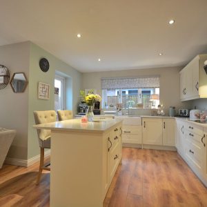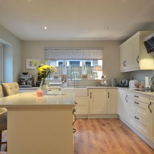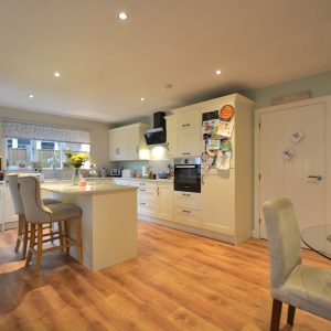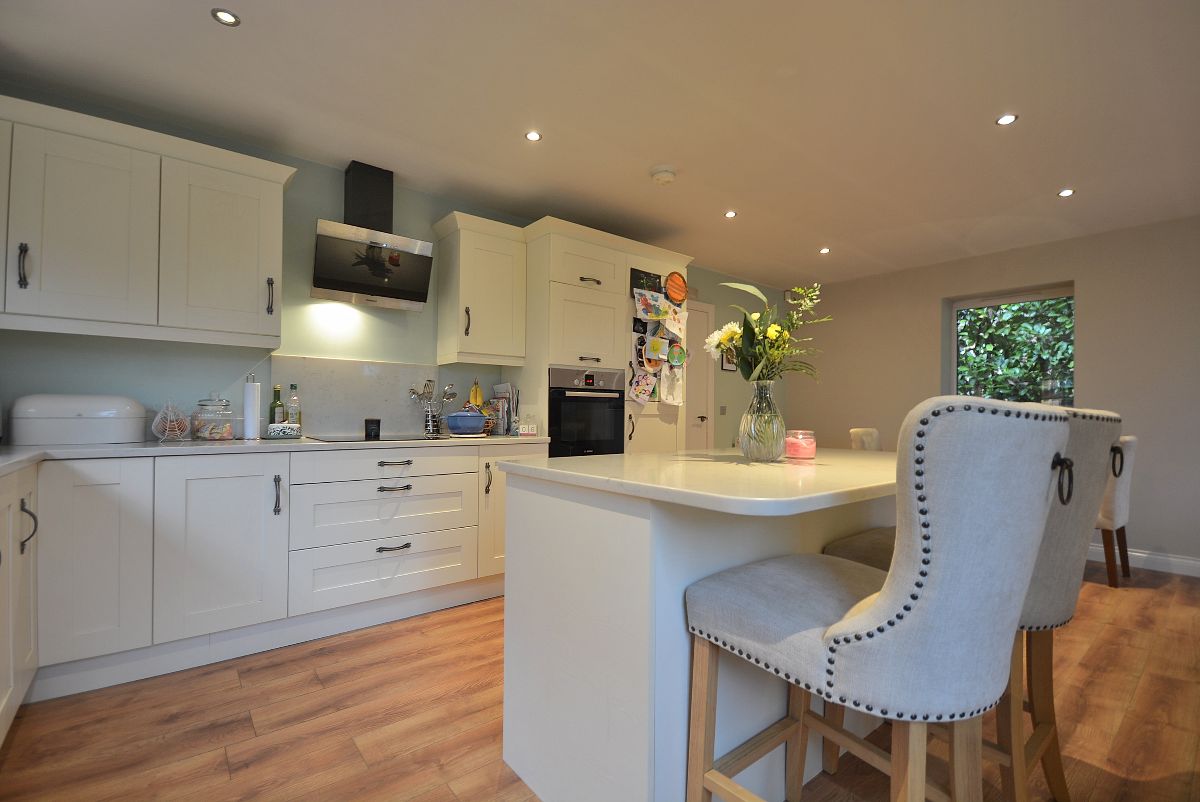 Having contemporary high gloss base units and quartz worktops. Inset stainless steel sink with mixer tap. Plumbing for a washing machine. There is also a radiator and internal door into the former converted garage which is now a large double bedroom currently in use as a playroom and home office.