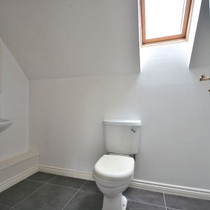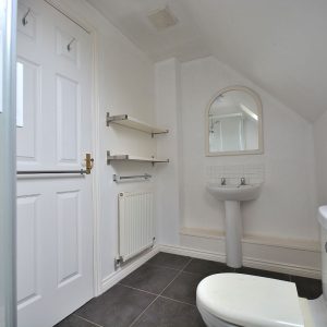 With a two piece suite comprising a low flush WC and wash hand basin. There is also a radiator, ceiling lighting and an obscure double glazed window.