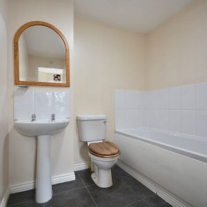 With three piece suite comprising a panelled bath, low flush WC and a wash hand basin with chrome taps. There is also a radiator, ceiling lighting and an extractor fan.