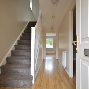 With a radiator, ceiling lighting and stairs rising to the first floor landing.