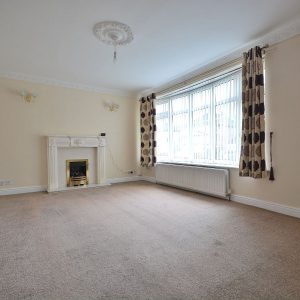 A spacious 16ft living room with a feature fireplace, ceiling lighting, radiator, TV point and a large double glazed bow window to the front elevation.