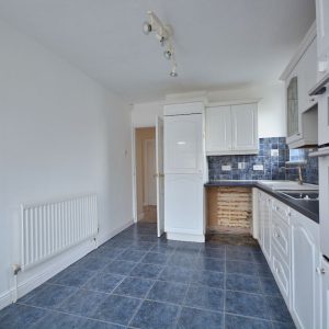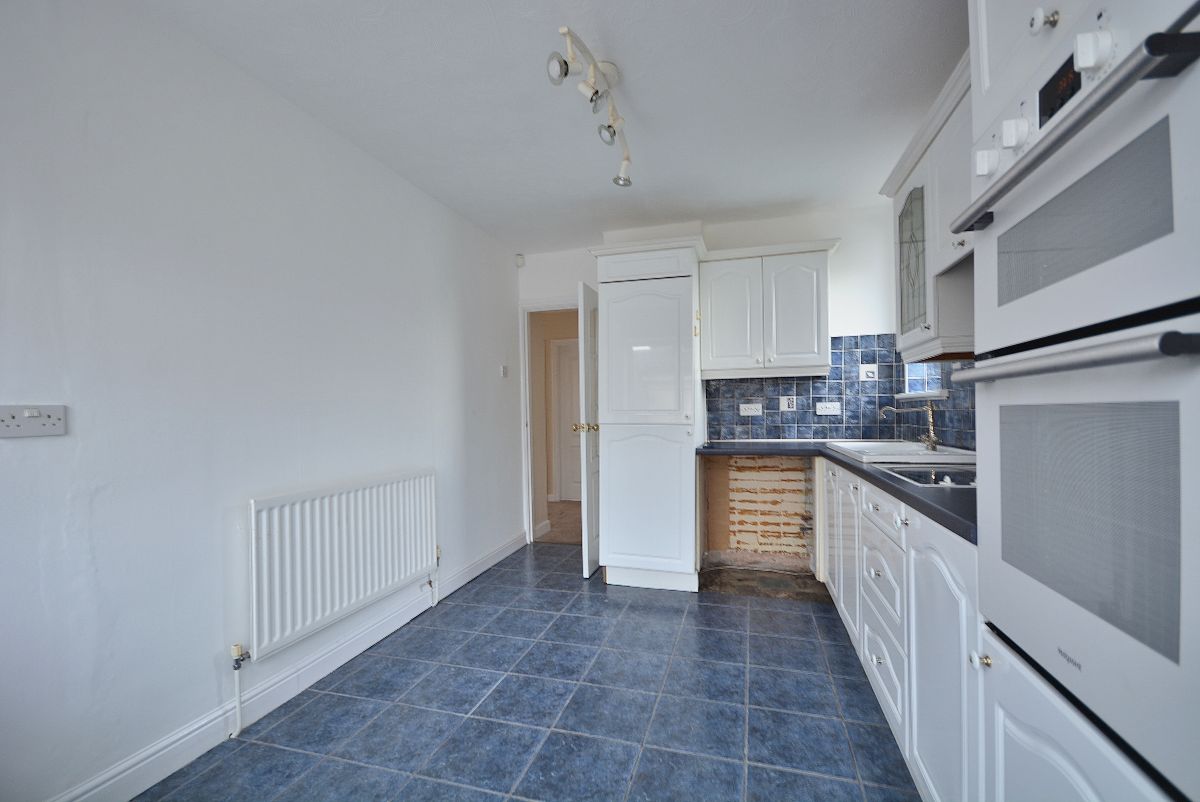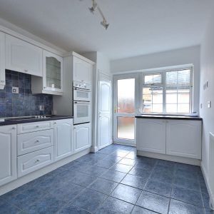 Fitted with a range of wall cupboards, base units and drawers with working surfaces over. Inset sink with drainer, integrated oven, four ring electric hob with wall mounted extractor hood over, tiled floor, tiled splashback, radiator, double glazed window and an obscure double glazed door to the rear elevation.