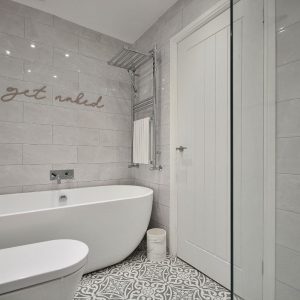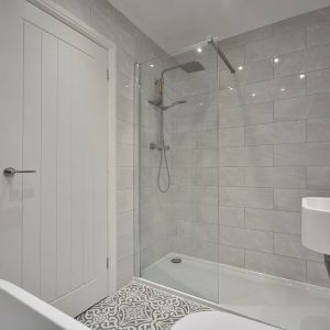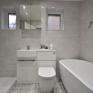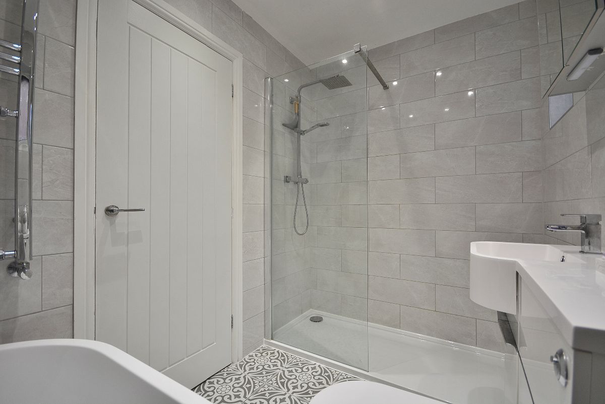 A stunning, sleek and stylish fully tiled family bathroom with four piece suite comprising a free standing contemporary bath with wall inset chrome mixer tap and wall inset temperature and water flow controls, double width walk in shower with internally plumbed chrome shower, vanity unit with inset wash hand basin and chrome mixer tap and storage. Towel radiator, wall mounted mirrored cabinet, ceiling spotlights, two double obscure double glazed windows to the side elevation.