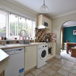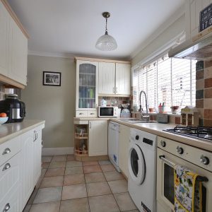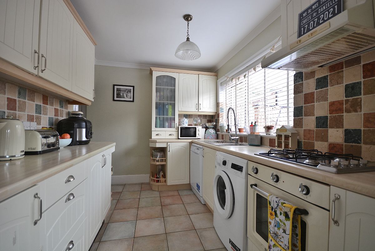 A well placed and well utilised kitchen that really does maximise storage having an array of wall cupboards, base units and drawers with working surfaces over. Inset sink with drainer and pull down chrome mixer tap. Integrated oven, four ring gas hob with wall mounted extractor hood over. There is also plumbing for a washing machine, opening round the corner offering space for a large fridge freezer, ceiling lighting, double glazed window and door to the rear elevation.