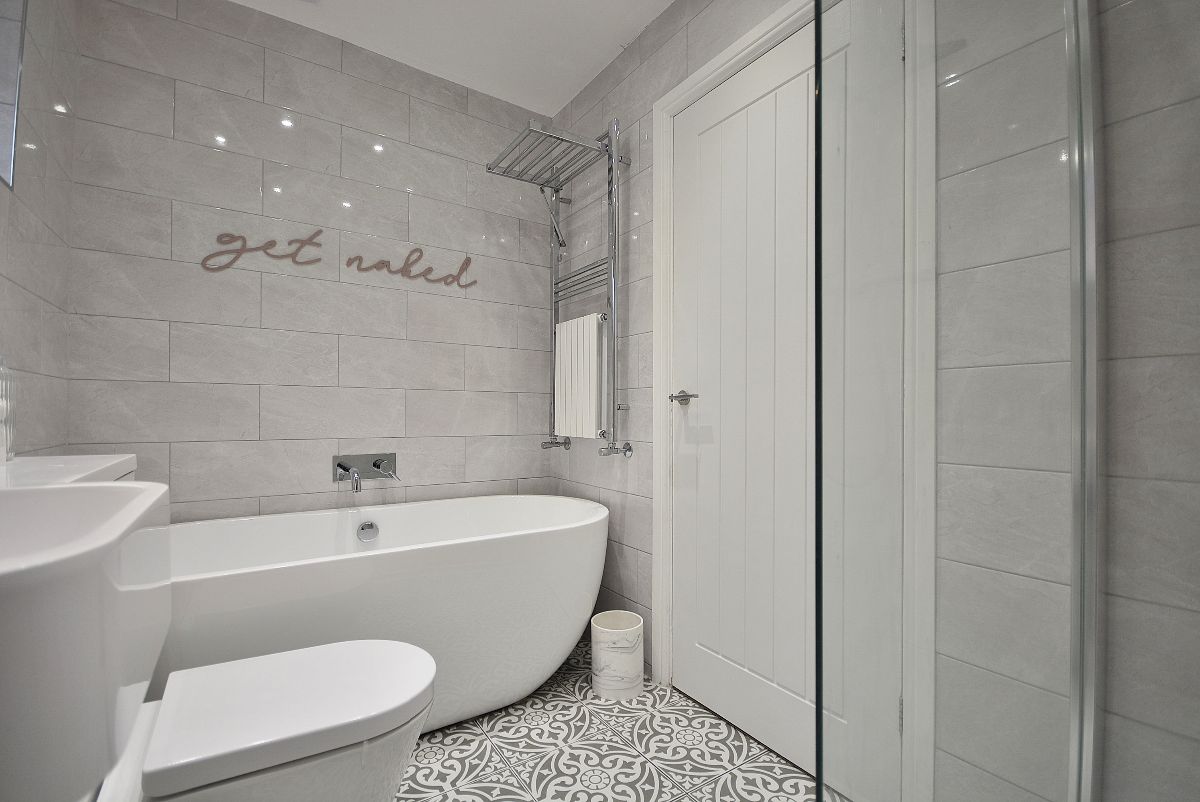A stunning, sleek and stylish fully tiled family bathroom with four piece suite comprising a free standing contemporary bath with wall inset chrome mixer tap and wall inset temperature and water flow controls, double width walk in shower with internally plumbed chrome shower, vanity unit with inset wash hand basin and chrome mixer tap and storage. Towel radiator, wall mounted mirrored cabinet, ceiling spotlights, two double obscure double glazed windows to the side elevation.