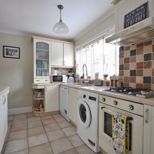 A well placed and well utilised kitchen that really does maximise storage having an array of wall cupboards, base units and drawers with working surfaces over. Inset sink with drainer and pull down chrome mixer tap. Integrated oven, four ring gas hob with wall mounted extractor hood over. There is also plumbing for a washing machine, opening round the corner offering space for a large fridge freezer, ceiling lighting, double glazed window and door to the rear elevation.