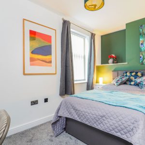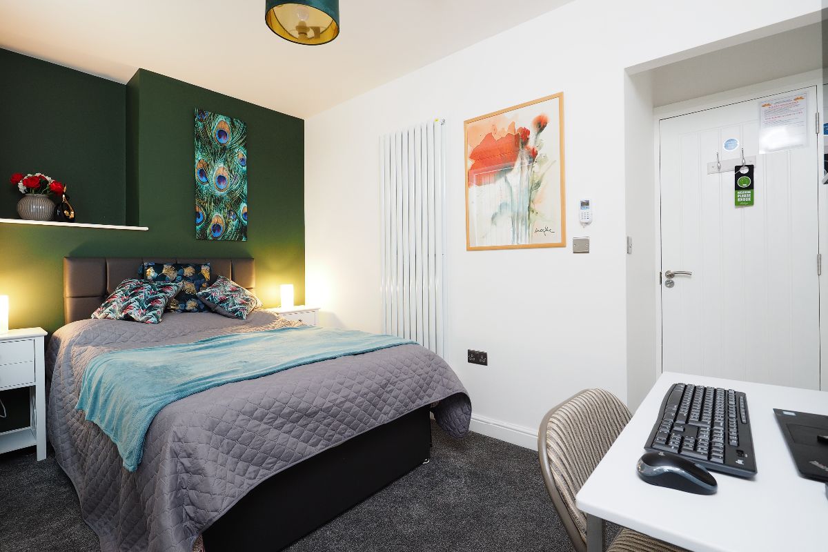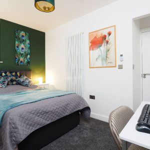 * Double bed, wardrobe, a chest of drawers, two 2-draw bedside tables with lamps, desk and chair for occasional homeworking