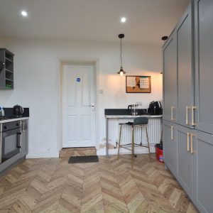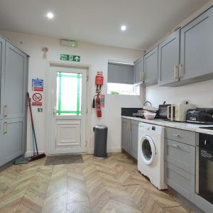 A communal kitchen having a range of wall cupboards, base units and drawers with working surfaces over. Inset stainless steel sink with drainer and mixer tap. Integrated oven with four ring hob and wall mounted extractor hood over. Space for fridge/freezer, plumbing for a washing machine. There is also a radiator, ceiling lighting and a double glazed window to the rear elevation and an access door opening to the rear elevation.