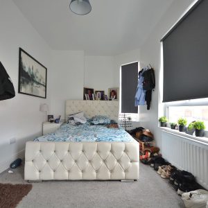 The first of four bedrooms with a radiator, ceiling lighting and double glazed windows to the front elevation.