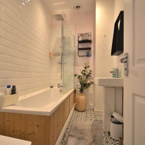 With three piece suite comprising of a panelled bath with wall mounted internally plumbed shower over, pedestal wash hand basin and a low flush WC. There is also a radiator, ceiling lighting and an extractor fan.