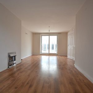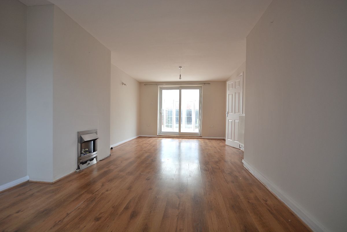 A large lounge diner with a central inset electric fire. There is also a radiator, ceiling lighting, two radiators, double glazed windows to the front elevation and patio doors opening into the: