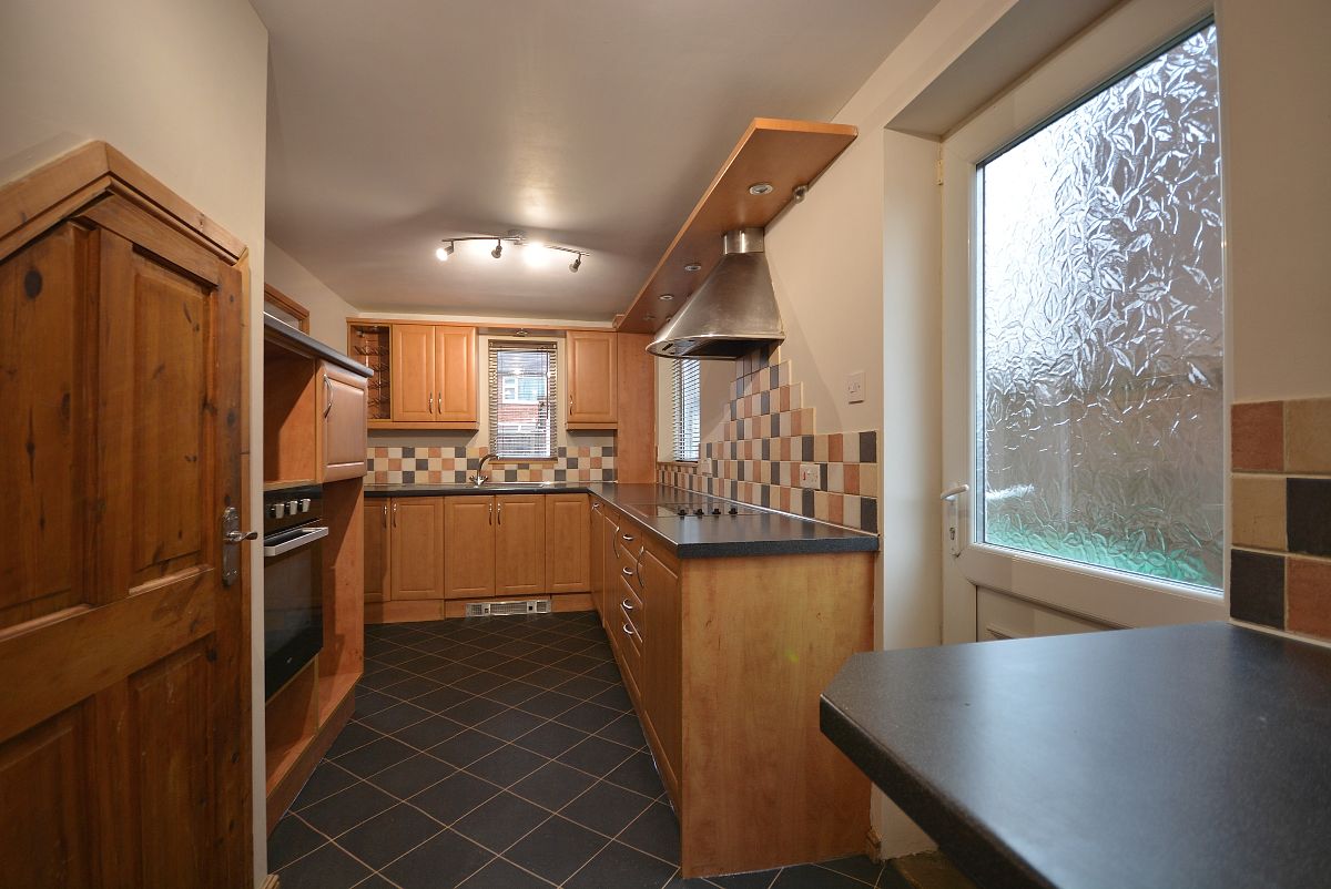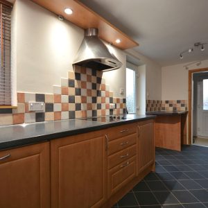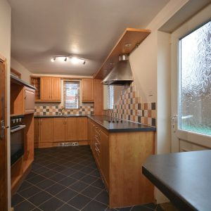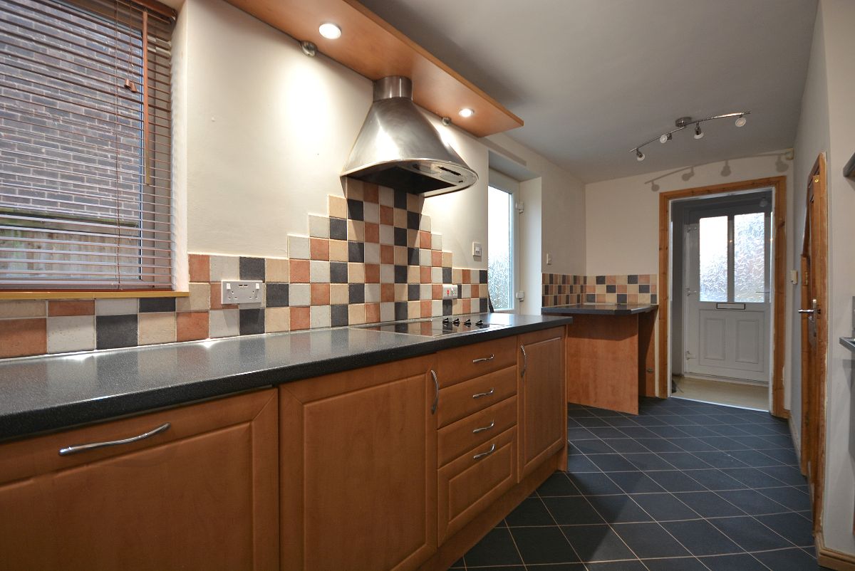 A neutral kitchen having a range of wall cupboards, base units and drawers with working surfaces over. Inset sink with drainer and chrome mixer tap. Integrated oven, four ring electric hob with wall mounted stainless steel extractor hood over. There is ceiling lighting, plumbing for a washing machine, space for a full height fridge/freezer and space for a tumble dryer. There is also double glazed windows and door opening onto the side & rear elevations.