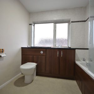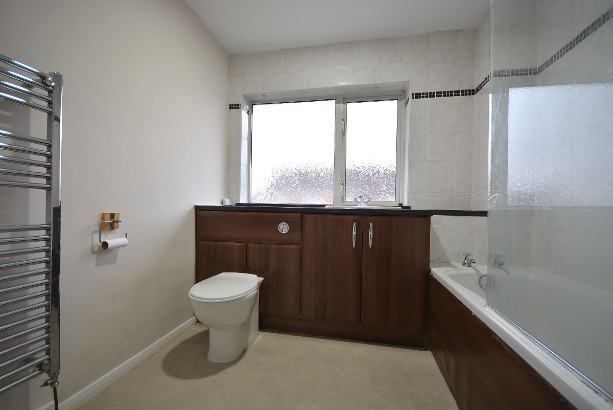 With a three piece suite comprising a panelled bath with shower over, wash hand basin and a low flush WC. There is also a radiator, ceiling light point and an obscure double glazed window to the rear elevation.