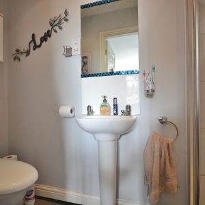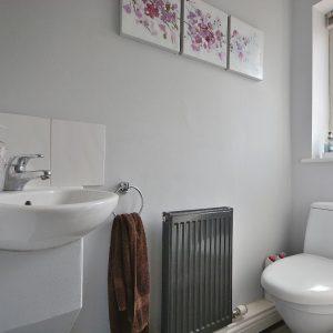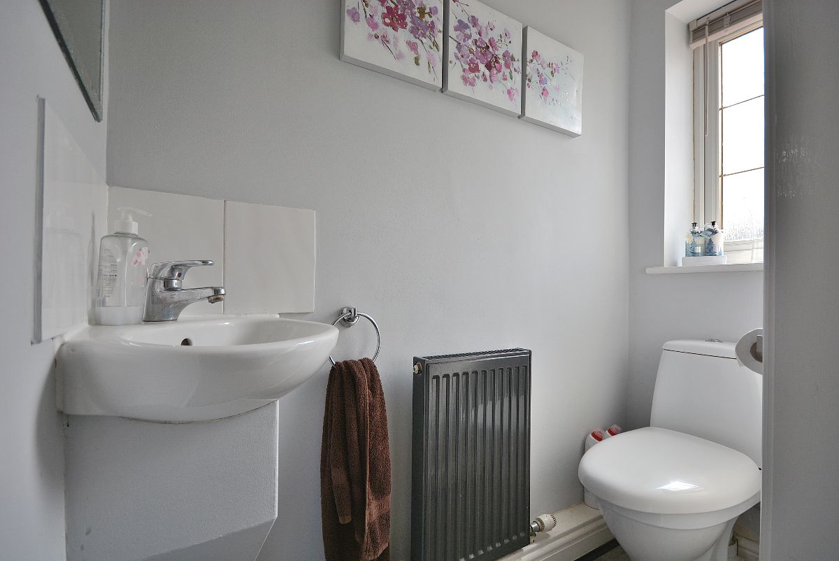 With a low flush WC and a wash hand basin with mixer tap. There is also a radiator, ceiling light point and an obscure double glazed window to the front elevation.