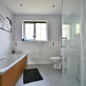 A large family bathroom with four piece suite comprising a panelled bath with mixer tap, double width shower enclosure with wall mounted shower, wash hand basin with chrome mixer tap and a low flush WC. There is also a radiator, ceiling lighting and an obscure double glazed window to the rear elevation.