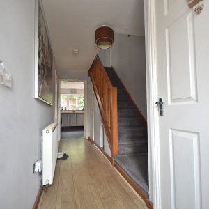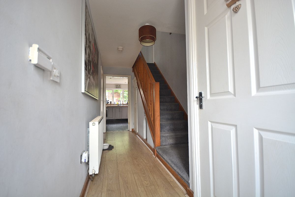 With a radiator, understairs storage cupboard, ceiling lighting, double glazed window to the front elevation and stairs rising to the first floor landing.