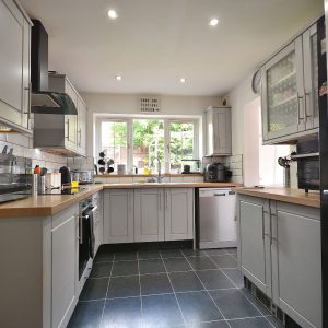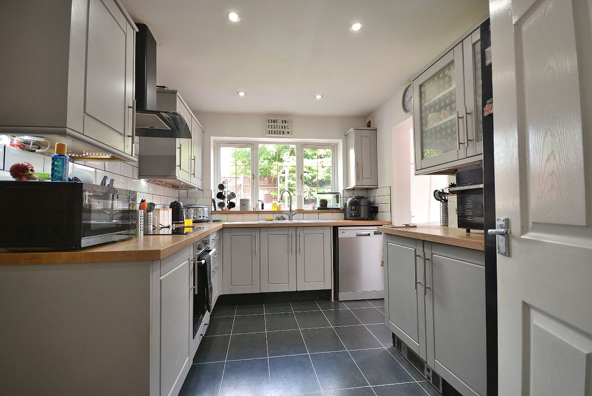 A modern yet timeless well planned kitchen having a substantial range of wall cupboards, base units and drawers with working surfaces over, inset sink with drainer and chrome mixer tap. Integrated oven, four ring electric hob with wall mounted extractor hood over. Plumbing for a dishwasher, space for a fridge/freezer. There is also ceiling lighting, double glazed window to the rear elevation and door into both the dining room and into rear lobby into a large utility store.