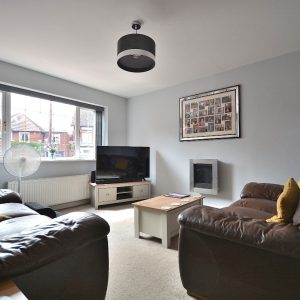 A cosy yet spacious lounge with a radiator, ceiling lighting, double doors opening through into the dining room and a double glazed window to front elevation.