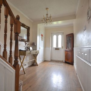 A large entrance hall with a radiator, ceiling lighting, storage cupboard and stairs rising to the first floor landing.