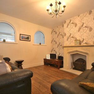 The first spacious reception room with a central feature fireplace, radiator, ceiling light point and a double glazed bow window to the front elevation.