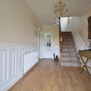 A large entrance hall with a radiator, ceiling lighting, storage cupboard and stairs rising to the first floor landing.