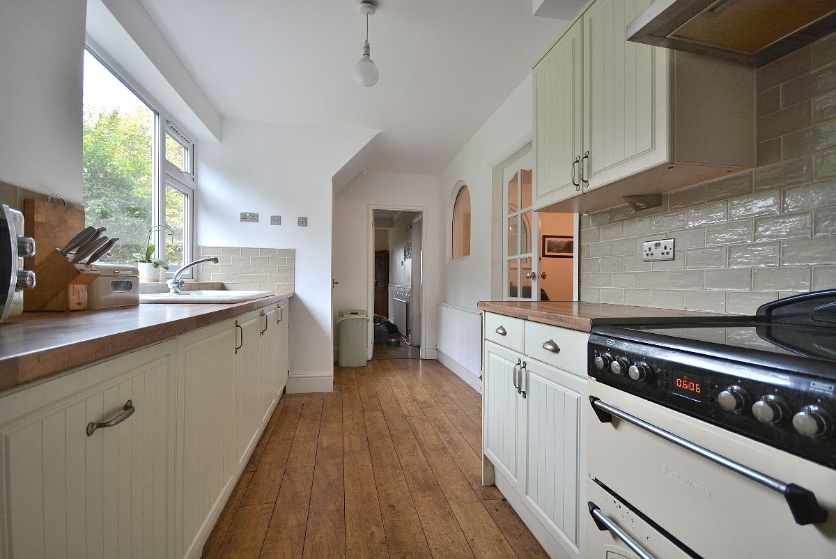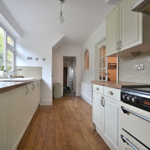A generously sized kitchen fitted with a large amount of storage units including wall cupboards, base units and drawers with working surfaces over. Inset sink with drainer. Space for a cooker, wall mounted extractor hood. There is also an integrated fridge/freezer, integrated dishwasher, ceiling lighting, understairs storage cupboard, double glazed window to the side elevation and access door opening into the rear lobby area and downstairs WC. There are also double doors opening into the second large reception room.