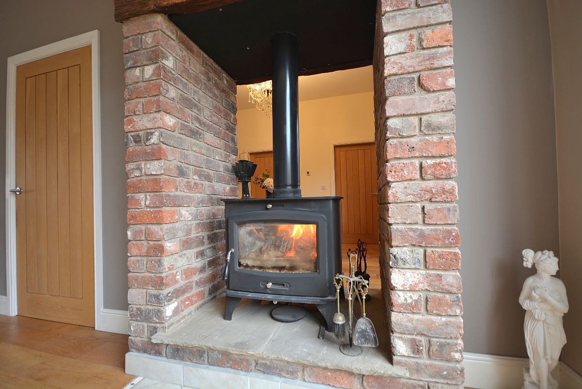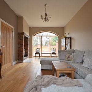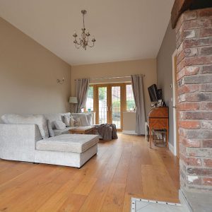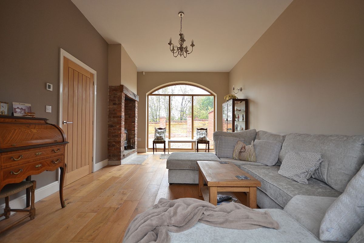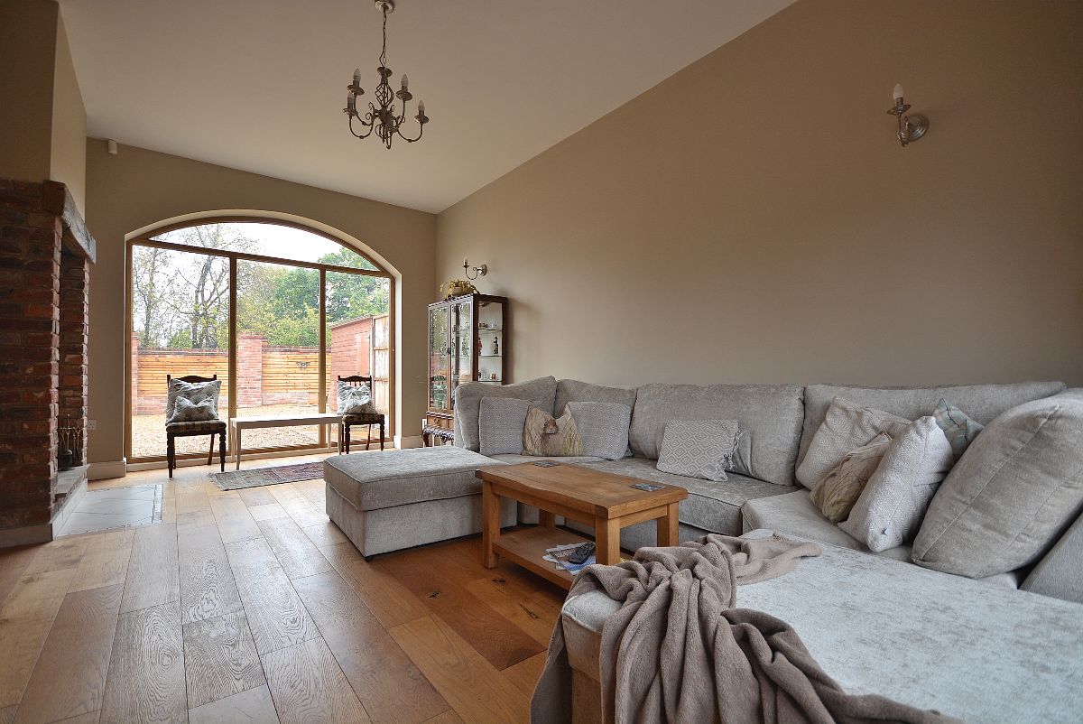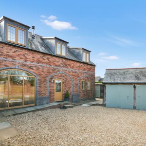Highlights include full-height arched windows that echo the original barn entrance, an exposed brick double-sided fireplace with inset log burner, engineered oak flooring, and an abundance of bespoke design details throughout.