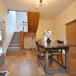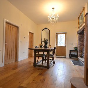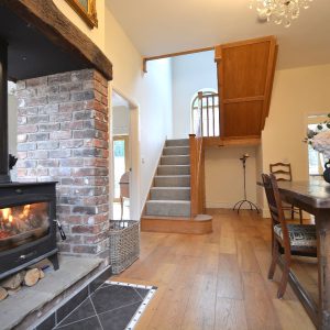 A stunning entrance to this fine property having engineered oak flooring with underfloor heating, under stairs storage cupboard with lighting and dual aspect feature fireplace with brick built surround and log burner. Internal door to the lounge, study, shower room and breakfast kitchen. Solid feature wrap around oak staircase to the first floor.
