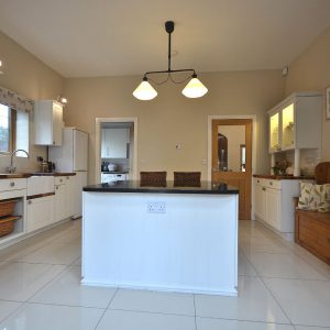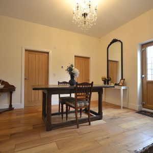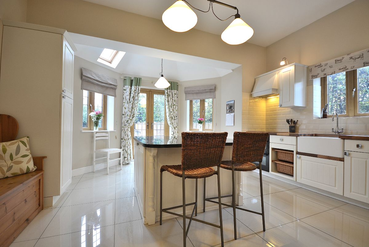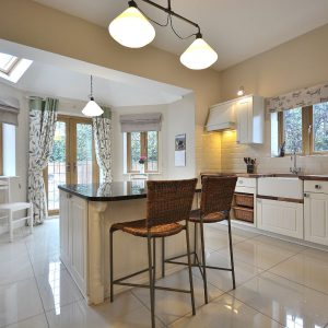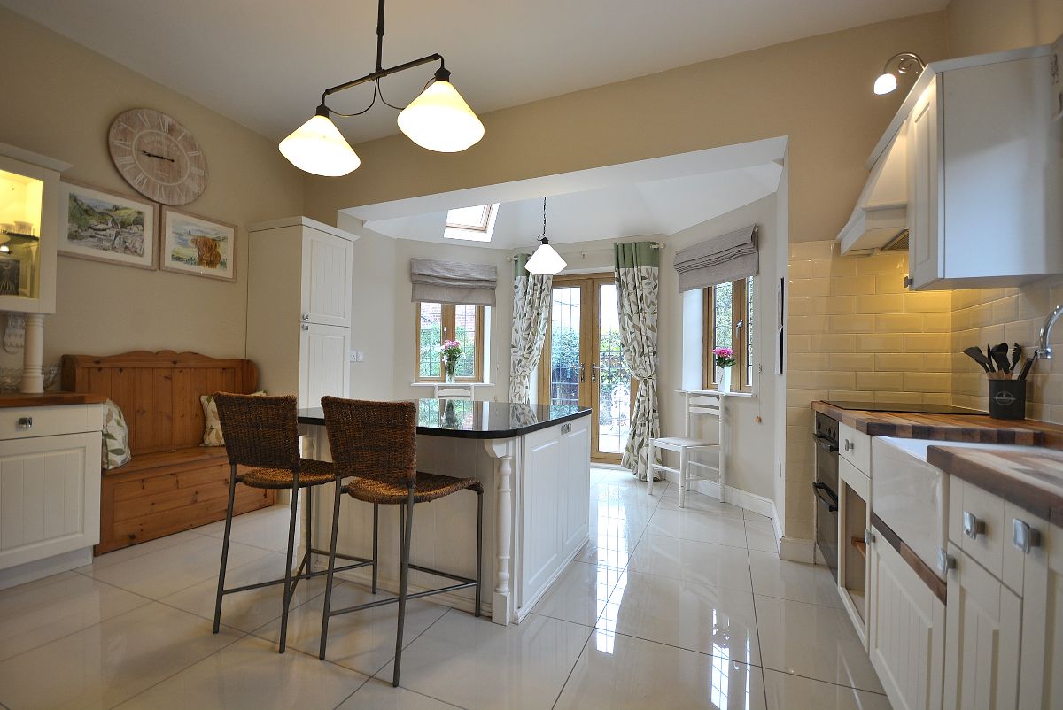 A beautifully finished and in keeping farmhouse style kitchen blending modern and timeless perfectly having a range of wall cupboards, base units and drawers with solid wooden worktops. A central island with granite working surface completes the look. There is also a Belfast sink and an integrated Neff oven. There is also space for a fridge/freezer, ceramic tiled floor with underfloor heating, feature bay with double glazed Velux window and double glazed doors opening onto the private rear garden.