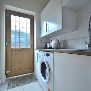 A handy and well placed utility with a range of matching wall & base units with worktop incorporating an inset one and a half bowl stainless steel sink & drainer unit with tap over. There is also plumbing for washing machine and dishwasher, wall mounted combi boiler and ceramic tiled floor with underfloor heating. UPVC door to the side.
