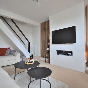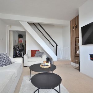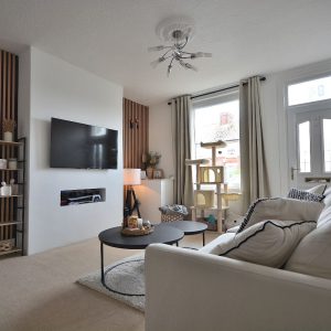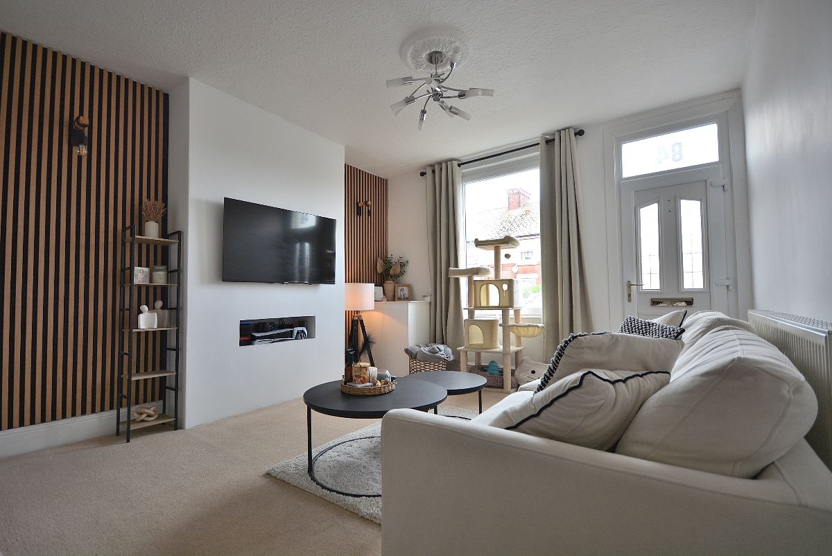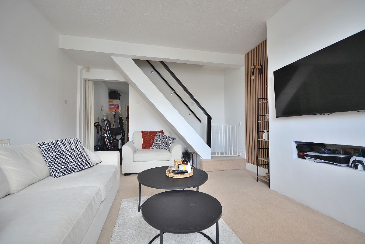 A spacious and beautifully presented living room with contemporary feature panelling. Radiator, ceiling lighting, stairs rising to the first floor landing and door opening into the: