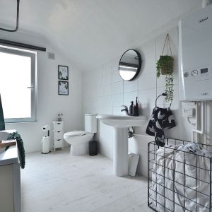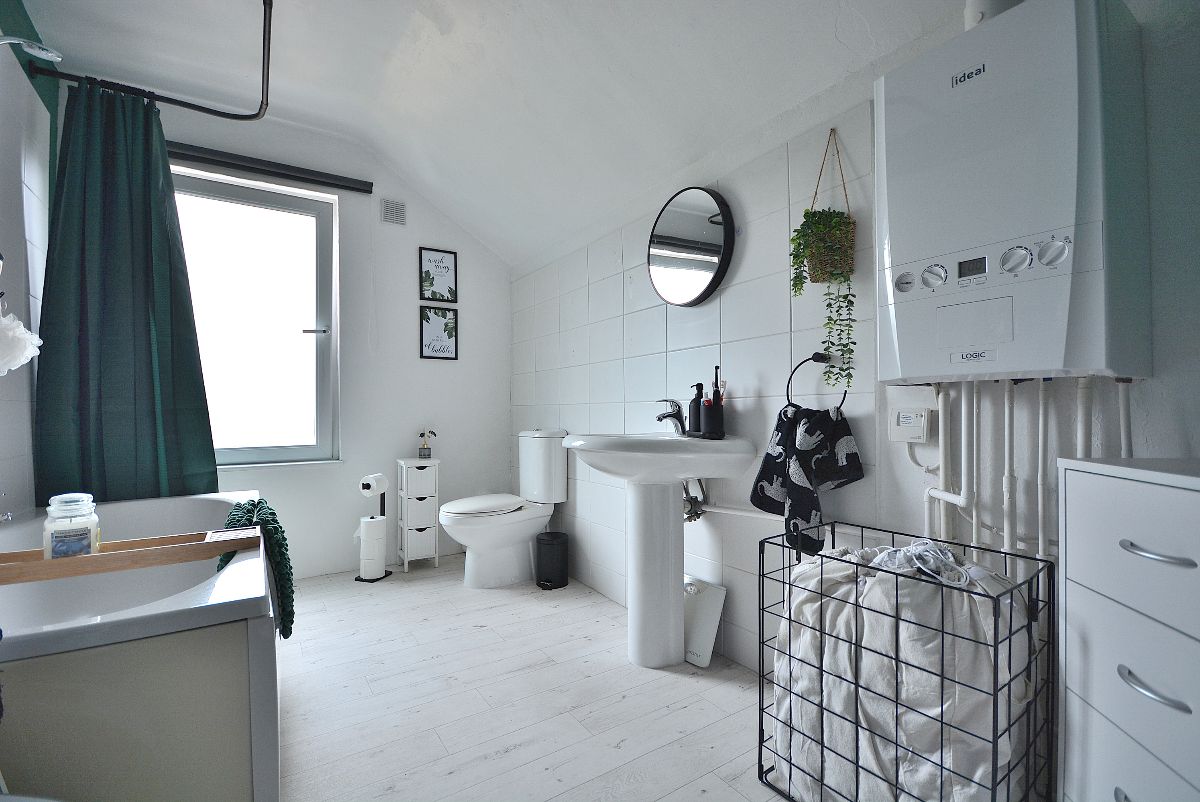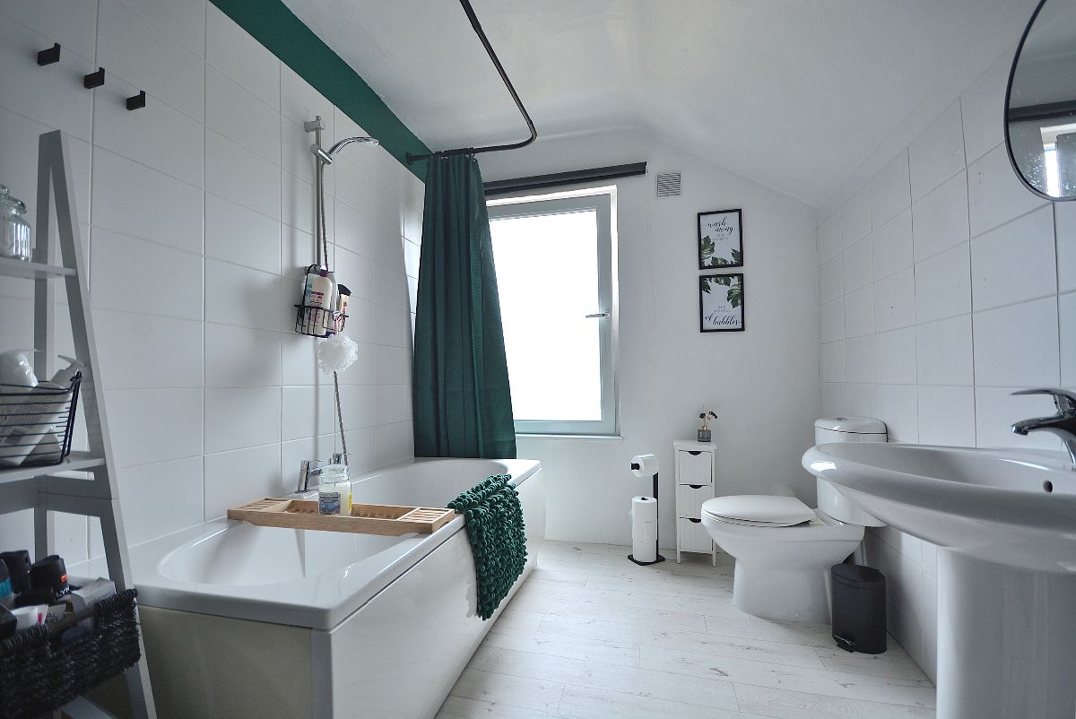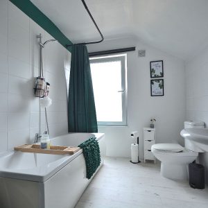 A well appointed large bathroom with a three piece suite comprising a panelled bath with shower over, wash hand basin with chrome mixer tap and a low flush WC. There is also a radiator, ceiling lighting, majority tiled walls and an obscure double glazed window to the rear elevation.