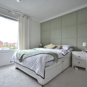 A large double bedroom with panelled feature wall, internal storage space utilised as a wardrobe, radiator, ceiling lighting and a double glazed window to the front elevation.