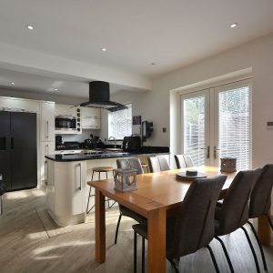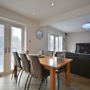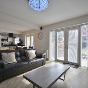 A large 31ft open plan living kitchen with three clearly defined areas. Comprising a kitchen area fitted with an extensive range of high gloss wall cupboards, base units and drawers with black granite working surfaces over. Inset sink with drainer area and chrome mixer tap. Integrated oven, four ring induction hob with ceiling hung extractor hood over. There is also an integrated dishwasher and space for an American fridge/freezer. There is also an array of LED ceiling spotlights, two sets of French doors and a window opening into the landscaped rear garden. Alongside a generous dining and separate living area.