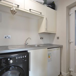 With wall cupboards and base units with working surfaces over. Inset sink with drainer and mixer tap, plumbing for a washing machine, space for a undercounter fridge, ceiling lighting and a double glazed door opening to the side elevation.