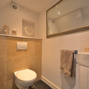 With two piece suite comprising a low flush WC and a wash hand basin with chrome mixer tap. There is also a radiator, sensor activated ceiling lighting and an extractor fan.