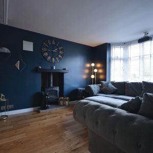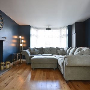 A cosy bay fronted reception room with a central feature fireplace with inset log burner and floating oak mantle. There is also oak flooring, radiator and a double glazed bay window to the front elevation and a double doors opening into the living kitchen.