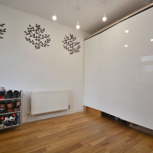 A well placed versatile study/home office with fitted high gloss storage but could also offer an additional sixth bedroom should it be required with ceiling lighting and a double glazed window to the front elevation.