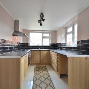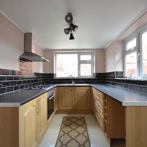 A fully fitted kitchen fitted with an extensive range of base units and drawers with working surfaces over. Inset sink with drainer and chrome mixer tap. There is an integrated oven, four ring gas hob with wall mounted extractor fan over. Plumbing for a washing machine, space for a fridge/freezer, tiled splashbacks, ceiling lighting and double glazed windows and door onto the rear elevation.