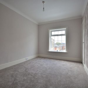 A spacious double bedroom with internally built cupboard, radiator, new carpet, ceiling lighting and a double glazed window to the front elevation.