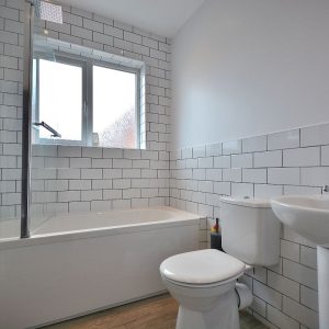 A well appointed modern bathroom having a three piece suite comprising a panelled bath with internally plumbed shower over, wash hand basin with chrome mixer tap and a low flush WC. There is also a radiator, ceiling lighting, majority tiled walls and an obscure double glazed window to the rear elevation.
