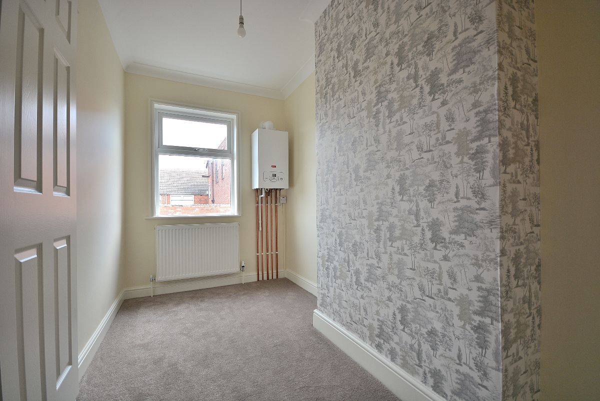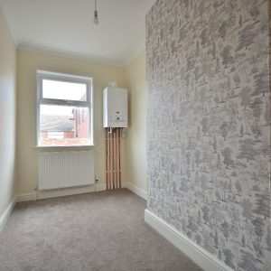A second generous bedroom with wall mounted recently fitted combi boiler, radiator, new carpet, ceiling lighting and a double glazed window to the rear elevation.